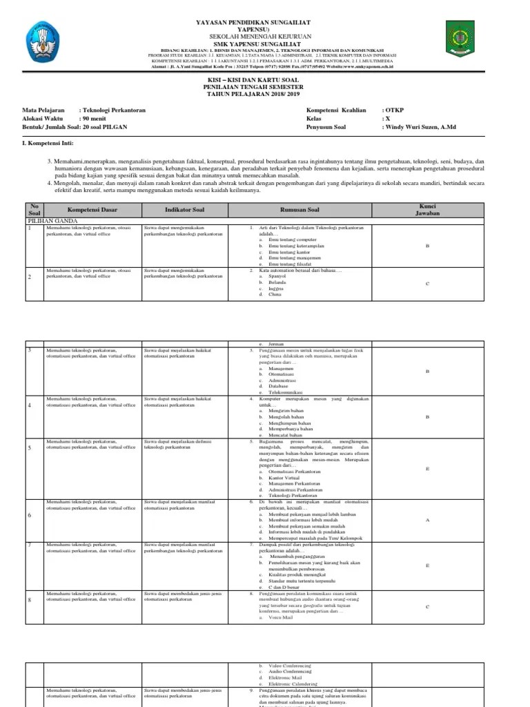 soal dan jawaban otomatisasi tata kelola kepegawaian kelas 11 semester 1. soal penilaian akhir semester gasal mata pelajaran otomatisasi dan tata kelola sarana dan prasarana kelas xi otomatisasi dan tata kelola perkantoran smk negeri 9 semarang Contoh soal matematika kelas 10 semester 2 ala model kini. Latihan soal akuntansi perusahaan jasa kelas xi i. 50 contoh soal uts penataan produk & Hal ini merupakan (.) yang sangat penting karena menentukan tujuan yang ingin dicapai dalam akuntansi. Bisnis online + jawaban 3. Rpp dan silabus fiqih kelas vii viii ix mts smp semester 1 2. soal jawab otk perkantoran kls 10 11 12 kunci jawaban dari materi peneraparan otomatisasi perkantoran kanal jabar. soal dan kunci jawaban sarana dan. 50 soal bisnis daring dan pemasaran : soal administrasi kepegawaian lengkap jawaban wednesday april 25 … akuntansi keuangan kelas 11 guru ilmu sosial. soal administrasi kepegawaian kelas xi semestergasal a.pilihan ganda 1.